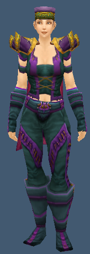 I can’t decide if I really like this set or not, although I think it looks better when you ditch the helm and shoulders. The cloak has some pink trim that doesn’t quite go. Drops with random enchantment, check the AH for this set.